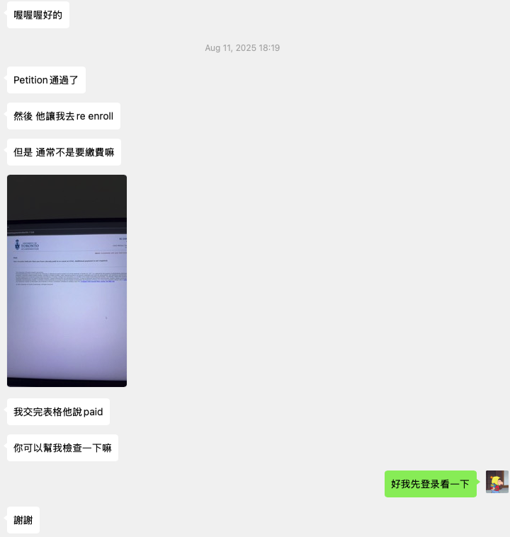 成功案例10 25F返校CGPA 0.3|港台同学求助,一月内拿下! Jan 17 Written By UofT . 这位同学一月末的时候联系我,她当时刚被停学,咨询停学后的学签问题,我帮这位同学进行了解答和初步的分析。 二月末的时候,她委托我全权处理停学申请。我在接下来的两个月帮助这位同学策划了很多活动,联系学校的各个部门,并且分配给这位同学一些任务让她一步步完成。不过这位同学暑假的时候打算在台湾实习,不打算上学。她决定等到7月份再去递交申请,于是在暑假的过程中我继续帮她一步步策划,不断丰富材料,我们也一直保持联系。在7月中的时候我们提交上了申请,学校不到一个月就出了结果。 就在上周,申请成功!happy ending! 不过我也没有停下,我继续帮助这位同学联系学校,处理复学,重新注册的相关手续。我的帮助不会在申请递交后后就结束,我希望帮助每一个同学回到学校继续上学,直到他们顺利毕业。 希望每一个在困境中的多大同学都能找到自己的motivation,都能重获力量。我希望用自己的经验和知识帮助大家,谢谢大家的信任。🙏 UofT .