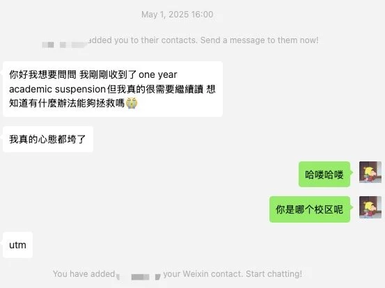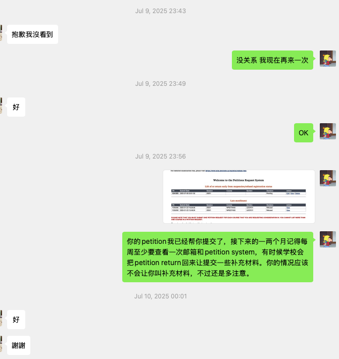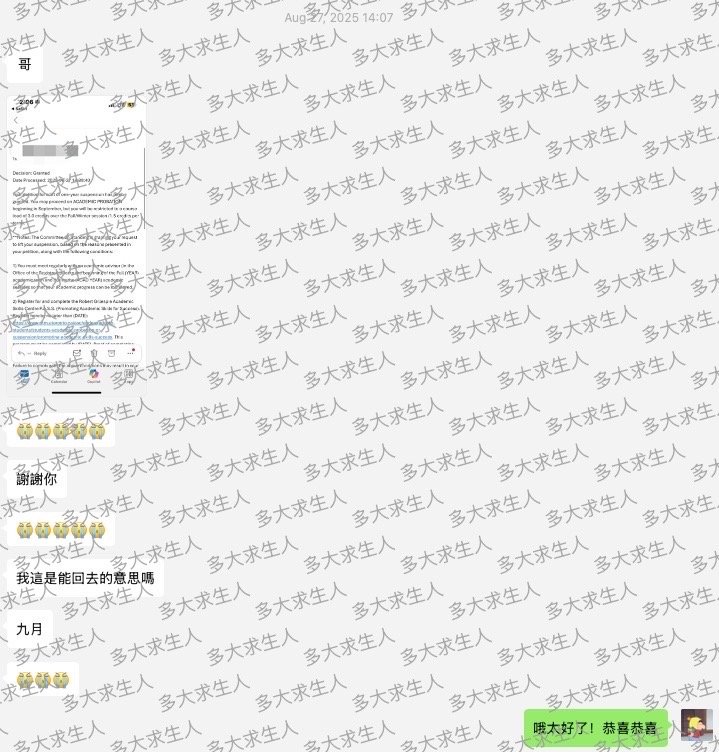 成功案例11 25F返校|港台同学求助:从“我真的心態都垮了”到“我真的是心中的壓力都放下了” Jan 17 Written By UofT . 今年暑假5月1日,这位同学刚收到停学通知后就联系了我。我帮这位同学进行了语音分析,让她去看了我的网站,这位同学当天就决定委托我去处理她的停学申请。 我登录这位同学的账号,一步步进行策划。在之后的两个月中持续和这位同学保持联系,为她策划活动,整理资料,准备文书,处理邮件。这位同学很responsive,每次都会当天回复我的消息,我安排的事情也都认真去做了。在七月初,我们准备、整理好了全部的材料以及文书,提交申请。提交后我也继续联系学校、催申请的进度。 就在这周,申请的结果下来了—通过!可以9月回去上学! 不过还没有结束:Acorn系统还没办法选课。我又帮助这位同学联系学校,催学校赶紧人工修改这位同学的status,让她可以赶紧选课。这位同学很开心,她5月刚加我的时候说“我真的心態都垮了”。(图1)在petition通过后,她又说“也謝謝你的幫助 我真的是心中的壓力都放下了 接下來我也會好好努力的”。 我又继续帮助同学联系学校,重新注册、处理学费问题、开启选课系统。。。 很开心我能帮助这位同学,让她重返学校,调整心态!我衷心希望每一个面临挫折、身在低谷的同学,都能获得一次改变自己、重新再来的机会。一时的挫折不算什么,只要不放弃、从现在开始改变就好,我自己的经历就是最好的证明(可以看看我的“从多大停学到全A”系列)。 UofT .