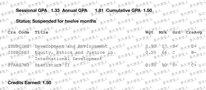 原因是:这门课的成绩被计入2024 Winter学期,导致她该学期的sessional GPA跌到1.7以下,未达标,学校随即作出一年停学的决定。