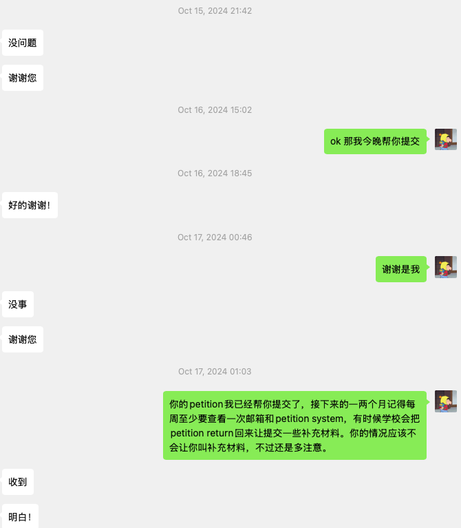 之后的一个多月,我和这位同学保持高密度沟通,深入整理了在学习中遇到的各类困难与挑战,并据此制定了个性化的文书策略、学习计划与活动安排。同时我也协助进行多次与学校之间的沟通,确保所有流程无缝衔接、无遗漏。