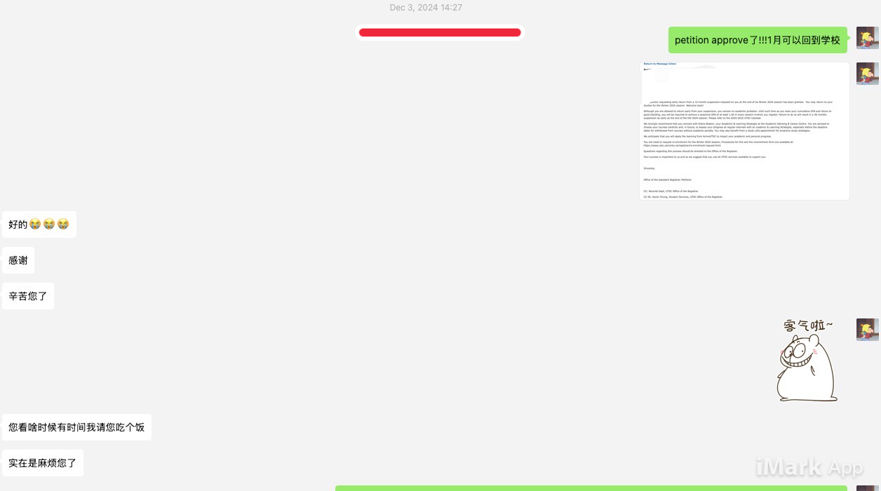 整个申诉过程中,我为她设计了一套系统的行动方案,从具体执行内容到写材料的切入角度,都有精细的规划。我要求她在停学期间不能“空等”,而是要开始构建新的学习节奏、建立自我管理习惯、尝试调整之前出问题的地方并且要和多大建立更多的联系。她非常配合,每一项都落到了实处,我在整个过程中不断地跟进、打磨她的材料,确保每一份提交上去的内容,都能体现出她真实且有说服力的改变。