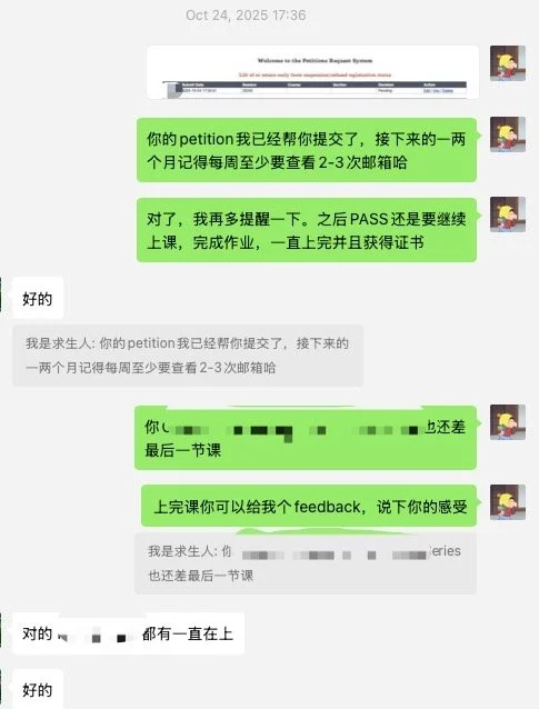 成功之后,我第 一时间登录他账号,帮他完成恢复注册资格的流程,让他能尽快选上冬季的课。开学前,我也会给他安排语音答疑,帮助他顺利回归校园生活,避开常见坑点。