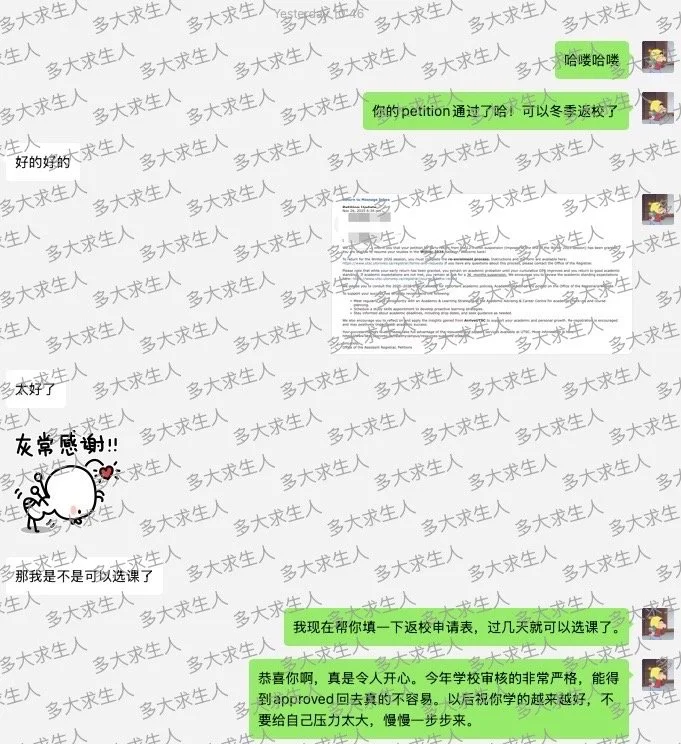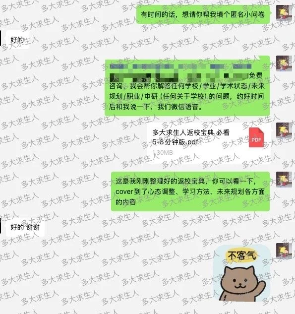 申诉通过后,我也继续协助处理返校注册、选课安排、答疑与学业规划,并发放我整理的《求生人复学宝典》📘,内容包括: